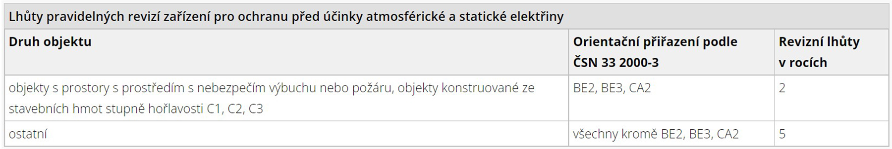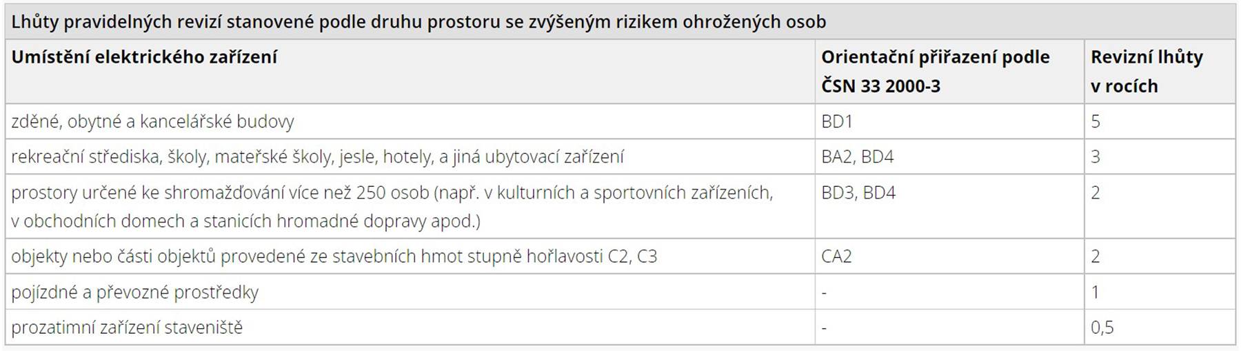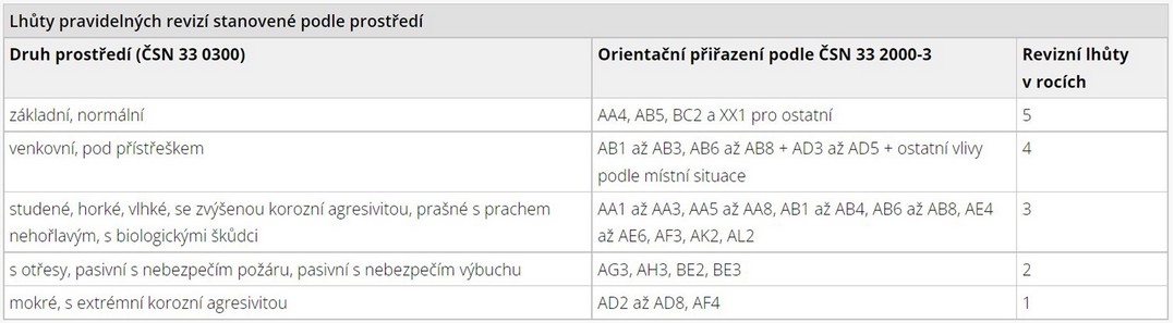 Lhůta pro provedení pravidelné revize se stanoví z následující tabulky v závislosti na umístění elektrického zařízení v prostoru se zvýšeným rizikem ohrožení osob nebo druhu prostředí v prostoru, ve kterém je elektrické zařízení umístěno.
