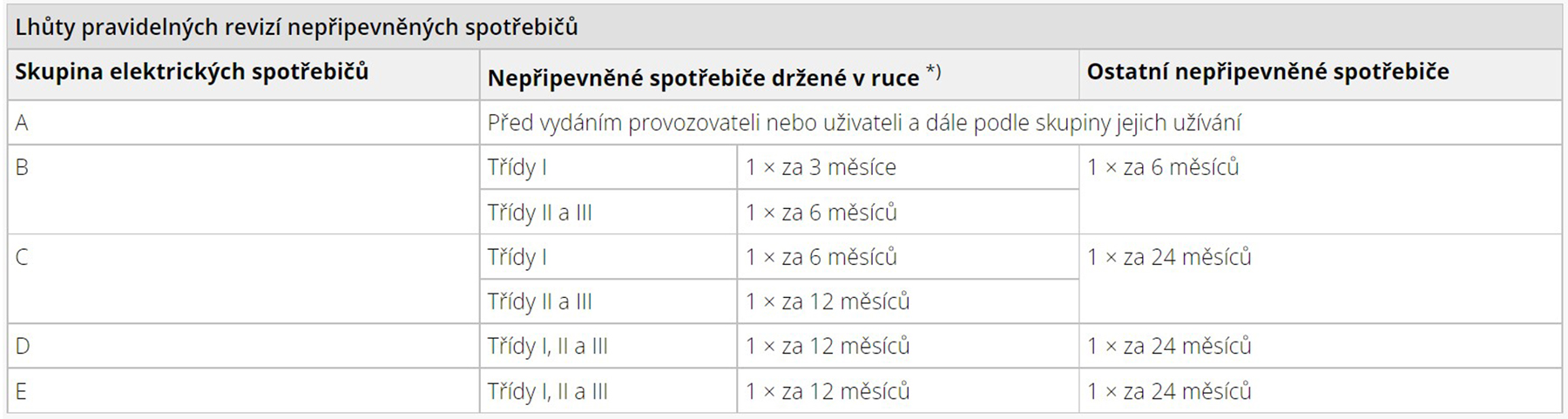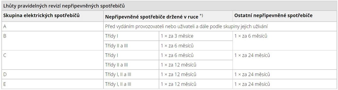 Lhůty pravidelných revizí elektrických spotřebičů držených v ruce a nepřipevněných spotřebičů jsou stanoveny v tabulce.