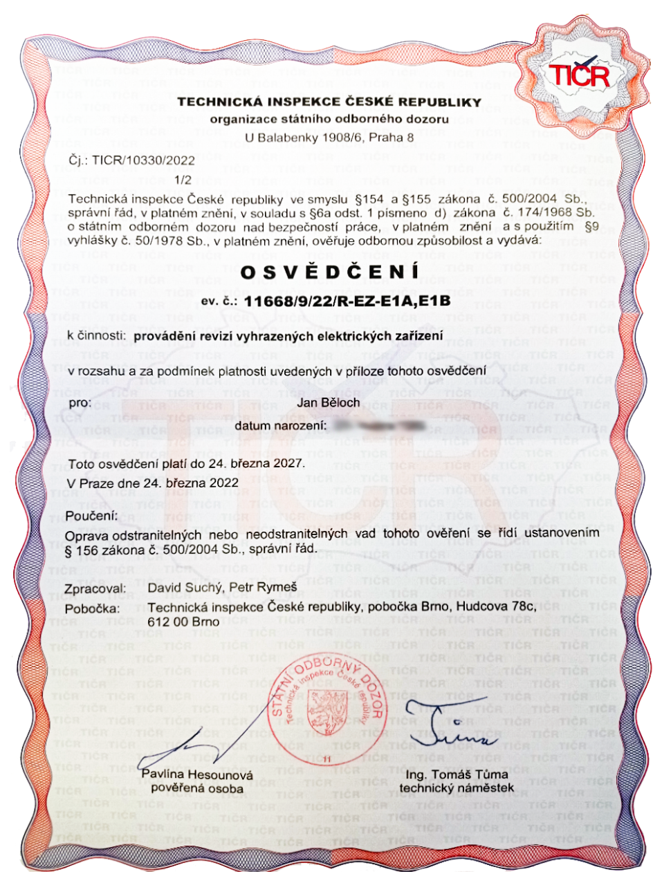 - kopii výučního nebo maturitního vysvědčení v oboru elektro